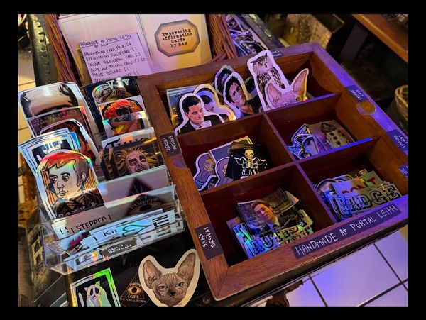 Both Sam and Derek have a huge range of stickers, prints and other treasures. You'll also find Derek's adorable crew of Portal Ghosts - each ghost is unique, handmade, painted, signed and numbered.